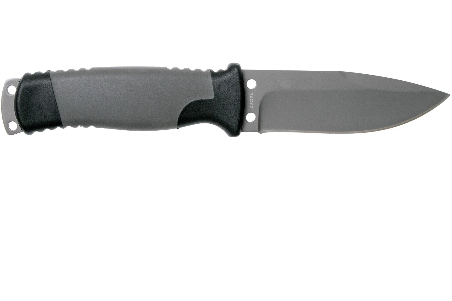 El Böker Plus Outdoorsman es un cuchillo fijo asequible para uso en exteriores. El mango de goma se siente muy bien en la mano y ofrece suficiente agarre. Debajo de una capa de goma se encuentra un núcleo de plástico sólido para una sensación de solidez. La hoja está hecha de acero Sandvik 12C27. Un tipo de acero inoxidable que conserva bien su afilado y además es fácil de afilar. En el extremo del mango sobresale una parte de la espiga de acero. Puedes utilizar esta parte como un martillo improvisado.
