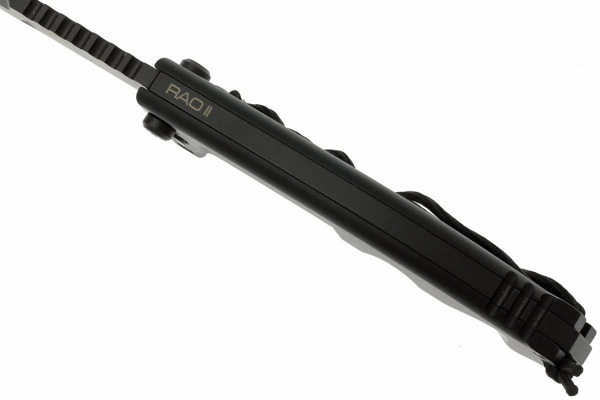 La Extrema Ratio RAO es una navaja táctica plegable muy sólida con una hoja muy pesada y fuerte, provista de un cierre extremadamente seguro más un mecanismo de seguridad adicional en forma de pasador de acero de ajuste manual. La funda cumple con los requisitos militares M.O.L.L.E. y se entrega con un afilador de diamante. La RAO puede guardarse en la funda tanto en posición plegada como desplegada. El desarrollo de este cuchillo es encargado por el ‘185° Rgt. ‘Ricognizione ed Acquisizione Obiettivi’ (Regimiento de Adquisición de Objetivos) aéreo ‘Folgore’ (185° RAO). El lema de este regimiento especial es: ‘Videre Nec Videri’ (Ver sin ser visto).