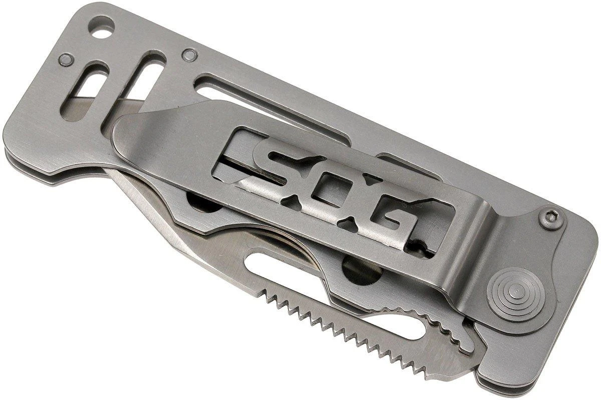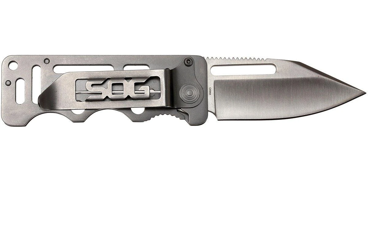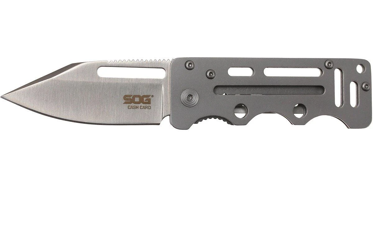 La navaja SOG Cash SOG – EZ1-CP es una navaja compacta y práctica para el uso diario. Tiene un hermoso mango esquelético, que no sólo parece resistente, sino que también reduce el peso. La hoja está hecha de acero 8Cr13MoV muy afilado. Se trata de un acero inoxidable muy fácil de afilar. Se abre bien y con suavidad gracias al orificio para el pulgar. El mango es de acero inoxidable, por lo que es duradero y muy ligero. Una vez abierto, la hoja se bloquea mediante un sólido cierre llamado liner-lock. Desliza el bloqueo liner-lock hacia la izquierda para cerrar fácilmente el cuchillo. El clip de bolsillo puede utilizarse para asegurar papel o tarjetas, como dinero en efectivo o un documento de identidad. Muy práctico cuando quieres salir sin llevarte toda la cartera. En combinación con su tamaño compacto, esto la convierte en una navaja ideal para EDC.